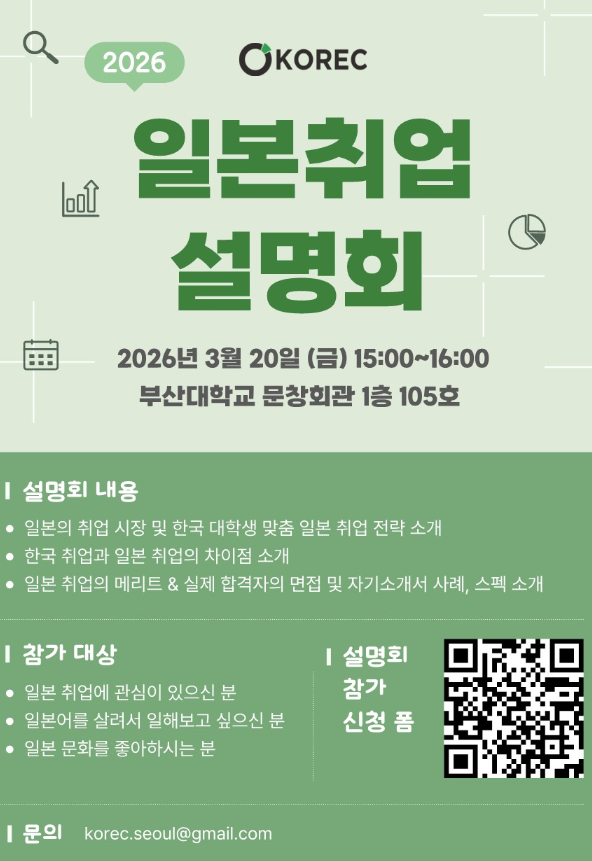 KOREC 일본 취업 설명회 | ?26. 3. 20.(금) 15:00~16:00 | 문창회관 1층 105호 |